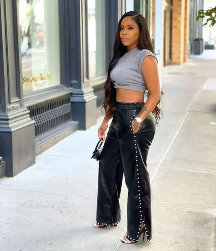 Fashion Leather Faux Pearl Wide Leg Pants