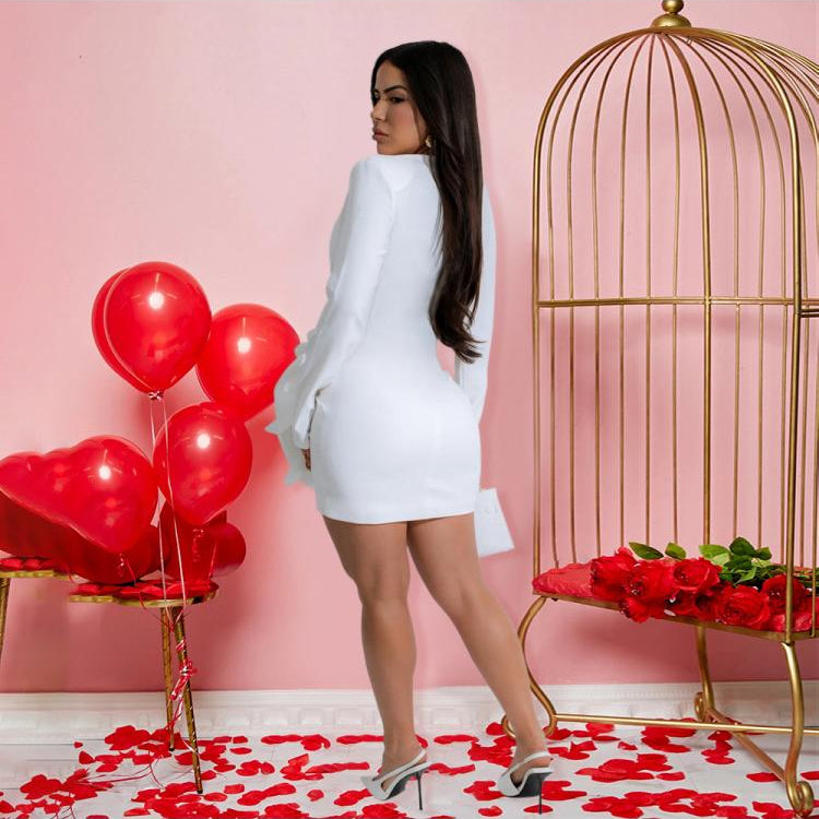 Sexy Deep V Pleated 3D Flower Long Sleeve Mini Dress